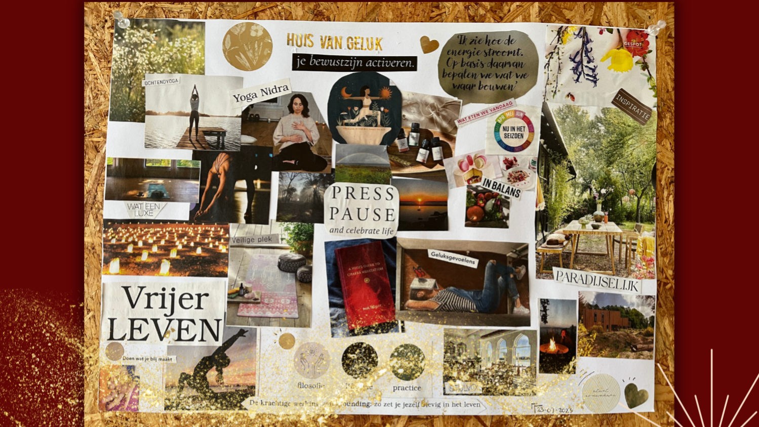 Je gaat naar huis met jouw unieke Visionboard die je op een mooi plekje in je huis neerzet als geheugensteun aan de richting die je op wilt om jouw droomleven te realiseren. Let’s create some magic!”